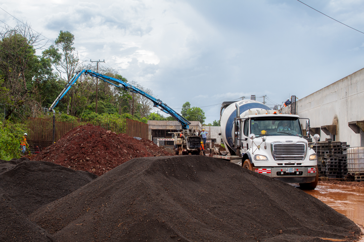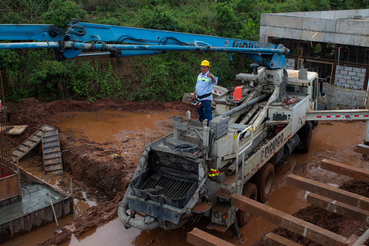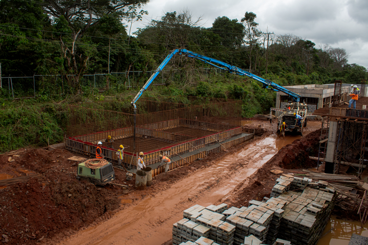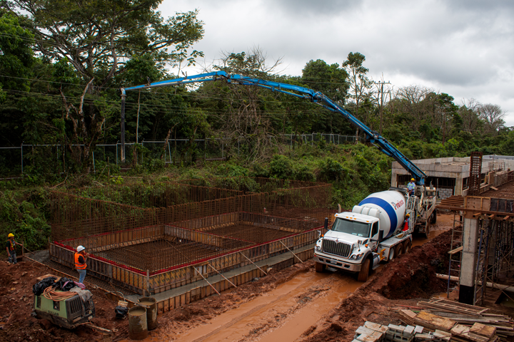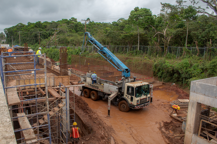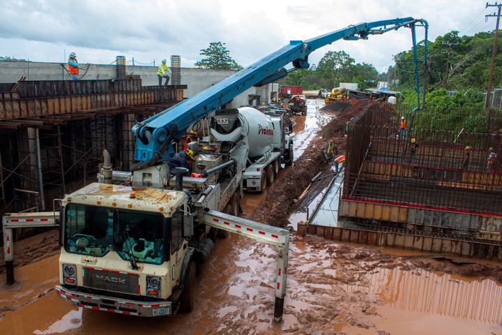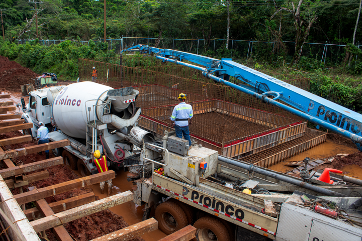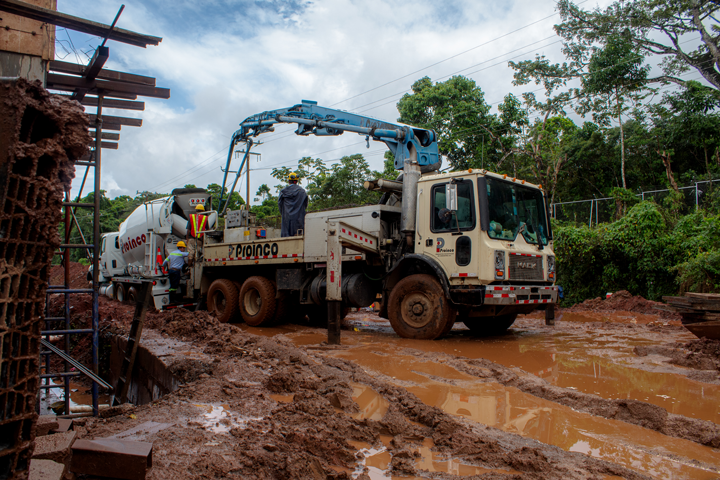 Uno de los principales retos técnicos fue el diseño de la mezcla de concreto, utilizando agregados y agua locales. Para ello, se realizaron múltiples ensayos de laboratorio con el fin de garantizar que la mezcla cumpliera con los estándares de resistencia, trabajabilidad y durabilidad exigidos por el proyecto. El clima predominantemente lluvioso de la zona también representó un factor crítico, lo que demandó ajustes en la planificación, almacenamiento de materiales y manejo del concreto durante su colocación, para evitar efectos adversos en su fraguado y resistencia final.